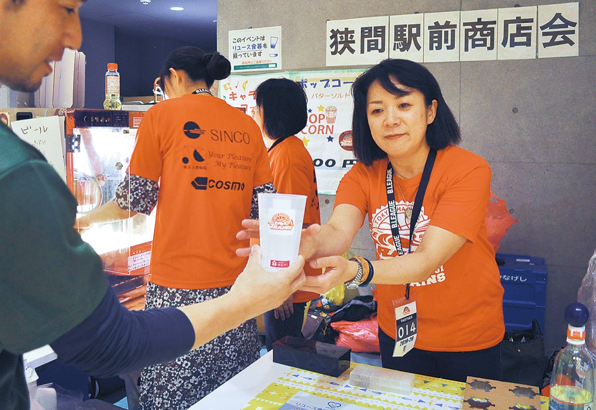 ストローなどのプラスチックごみが社会問題となる中、少しでもその削減に取り組もうと商店会が乗り出した。狭間駅前商店会(上野和正会長)では10月から、繰り返し利用できる「リユース食器」(カップ)を導入。同会が出店するプロバスケチームの試合会場で使用している。「五輪やワールドカップでは当たり前のようです。市レベルでもたくさん使われればいいですね」と担当者は話す。