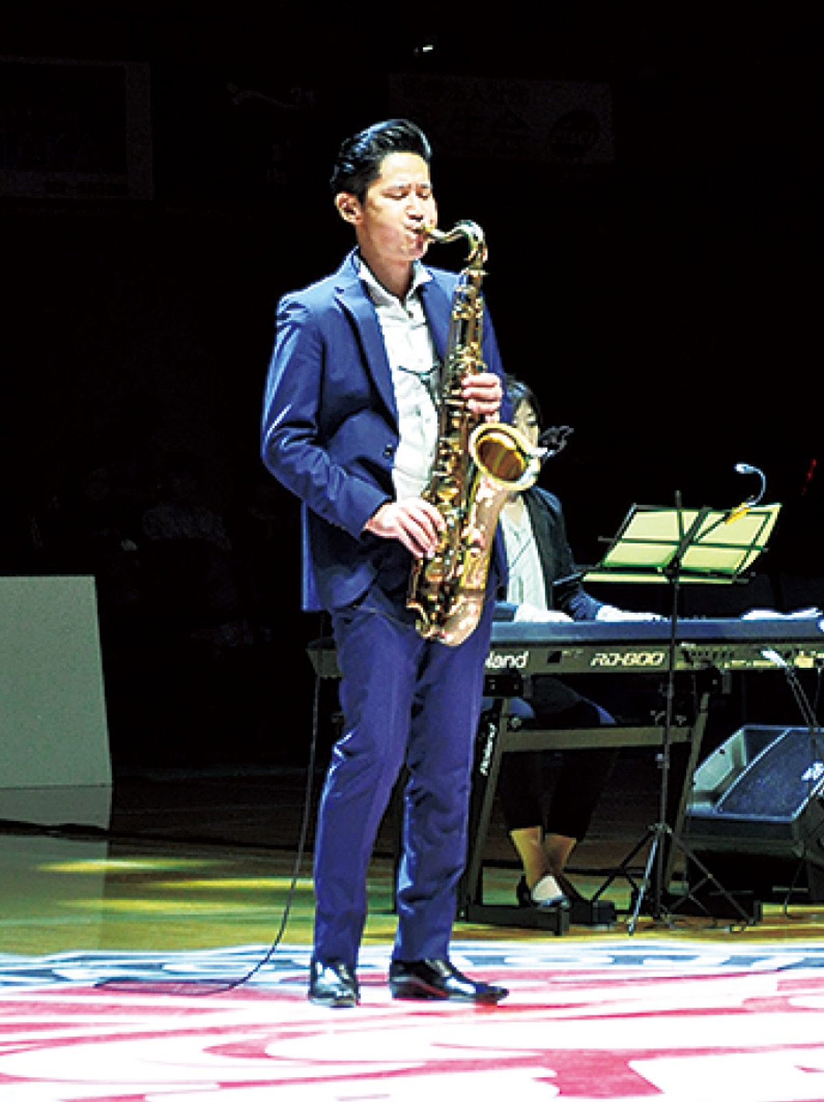 犬目町在住のサックス奏者、尾崎一宏さんが4日、エスフォルタアリーナ八王子であった東京八王子ビートレインズの公式戦で演奏した=写真。