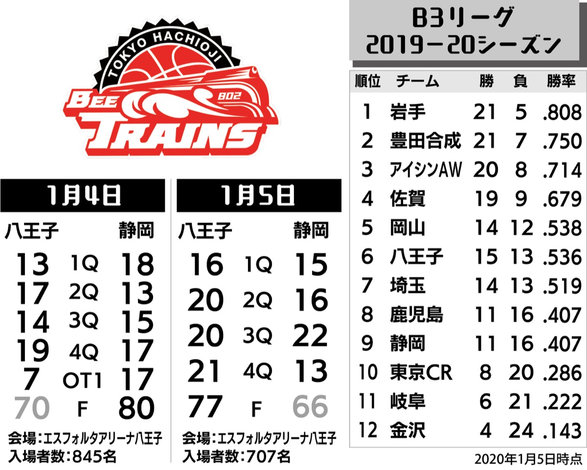 プロバスケB3東京八王子ビートレインズは1月4日と5日にエスフォルタアリーナ八王子でベルテックス静岡と戦った。4日は70―80で敗れ、5日は77―66で勝った。