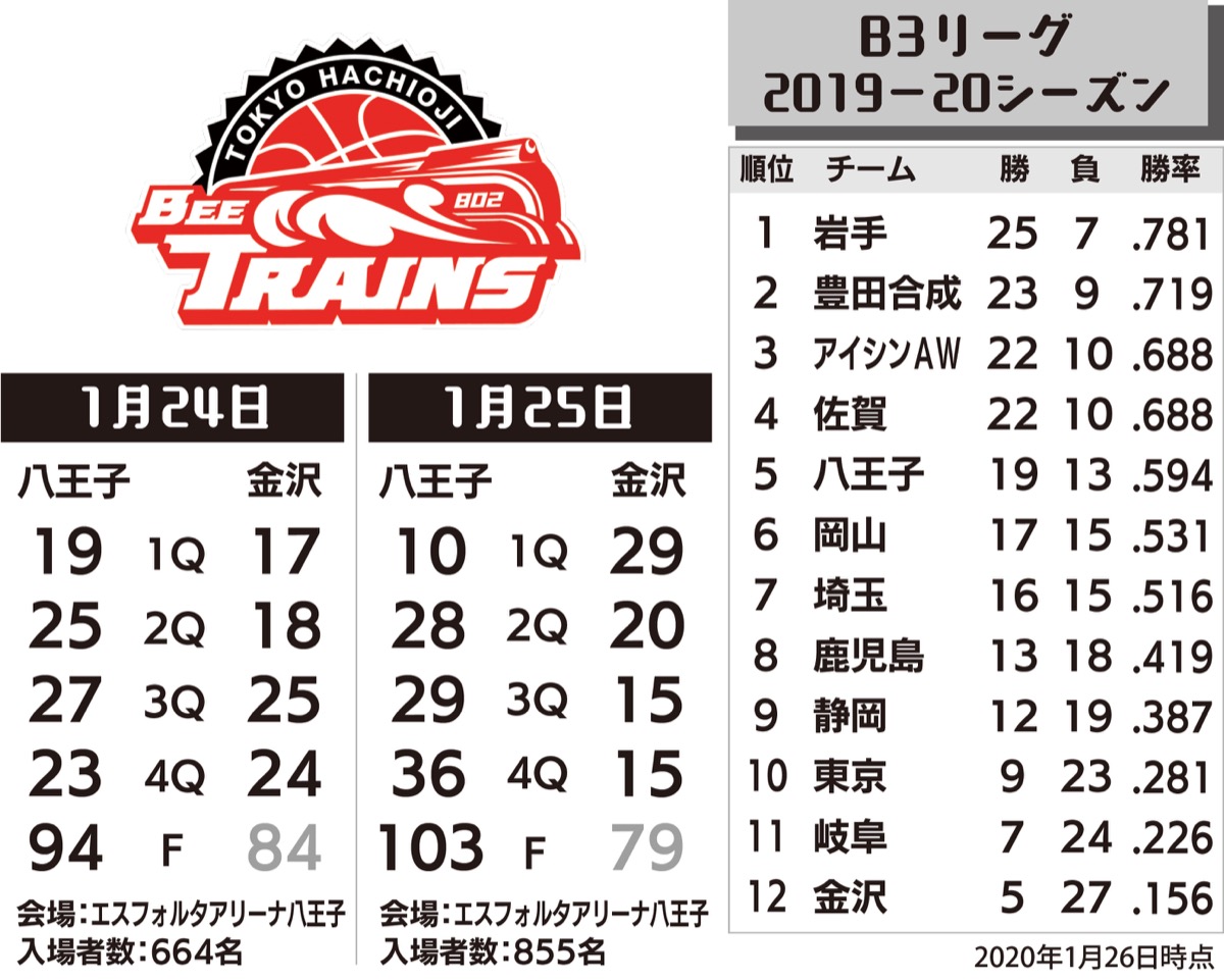 24、25日、チームはエスフォルタアリーナ八王子に金沢武士団を迎えた。24日は94-84で、25日は103-79で勝ち、5連勝となった。