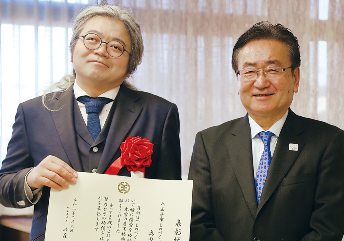 授与した石森孝志市長は「伝統文化を継承していただければ」と話した。奥田さんは「横の関係性が重要。まったく違う業種が結び付けば、新しいものが生まれる」と話した。