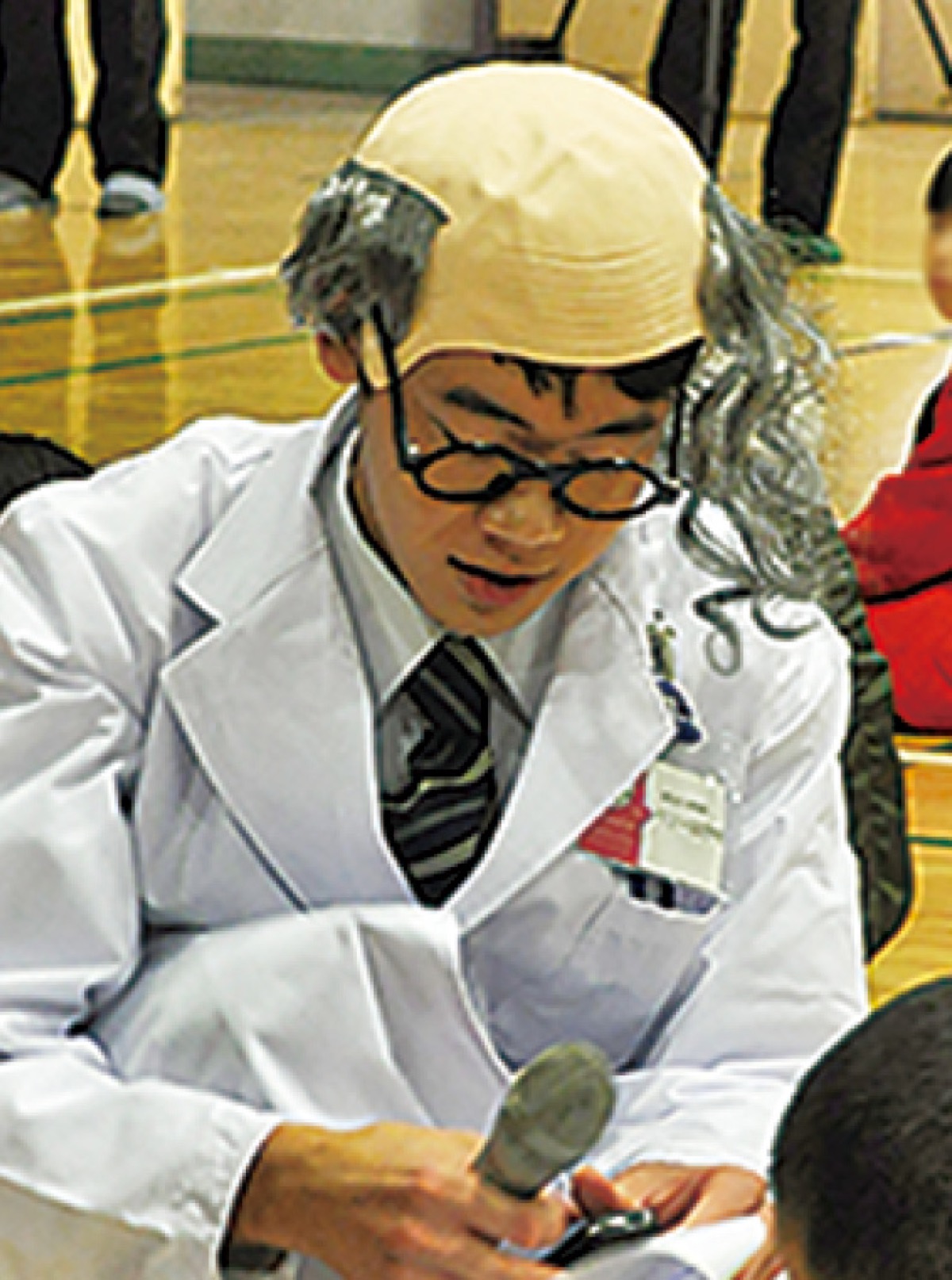 今回のパフォーマンスはチャンネル内の人気コンテンツ「べりーはかせのぼうさい研究所」に登場する「ぐっとくん(飛川さん)」と「べりーはかせ」(斎木宏共さん・高1)が担当。凝った仕掛けや息の合った掛け合いで来場者を喜ばせていた。小学校で指導する意義について飛川さんは「防災は子どものうちに身につけてほしい。子どもが知っていれば親の意識も変わるはず。子どもを中心に広がれば」と語った。見守った同校福田英徳教諭は「できるだけ応援したい」とエールを送った。
