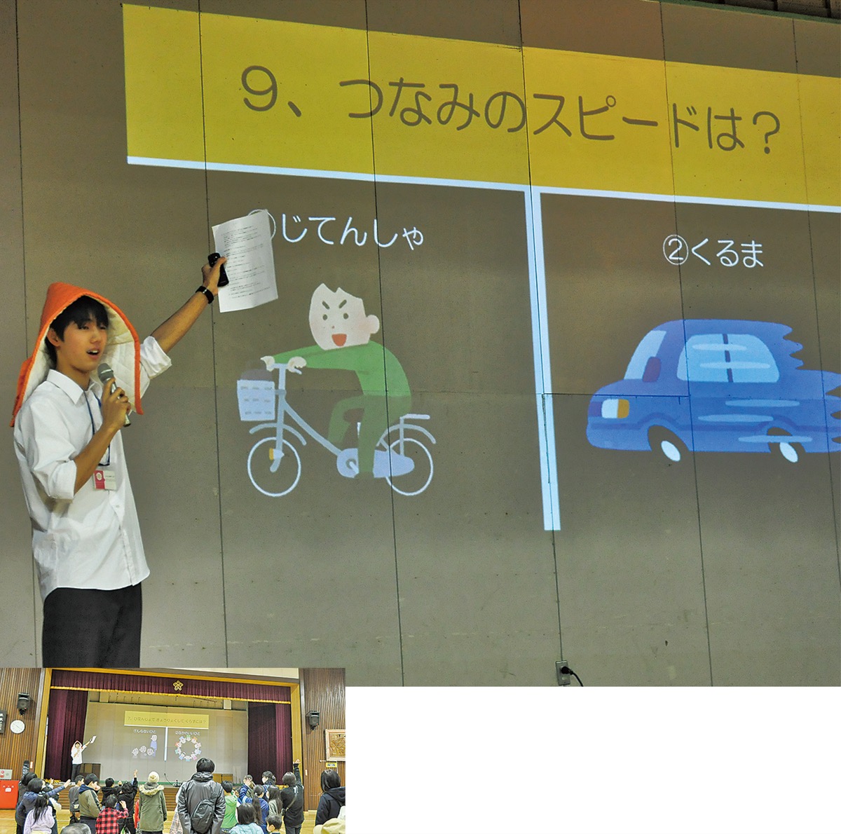 • 【上】 クイズを出題する飛川さん/【下】防災教室の様子