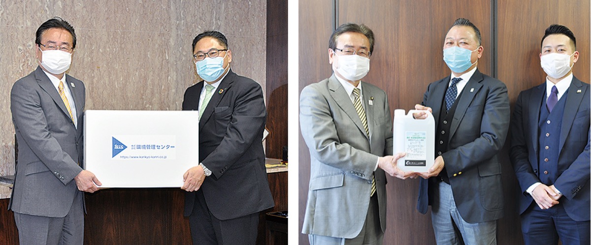マスクは3万枚が環境調査を専門とする、散田町の(株)環境管理センターから、消毒液は50リットルが省エネ機器などを製造する、千人町のミライラボ(株)(MIRAI─LABO)からそれぞれ寄付された。