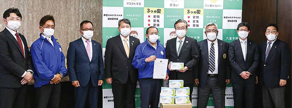 奉仕団体ライオンズクラブ(LC)の市内4団体が5月22日、八王子市にマスク1万枚を寄付した=写真。優先度の高い市内医療機関や福祉施設などに配布される予定。