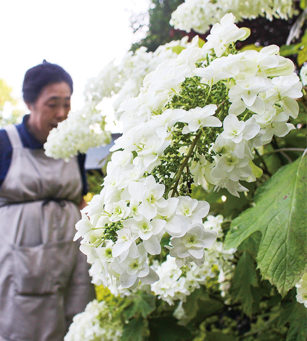 梅雨の時期を迎え、八王子市内でも色とりどりのアジサイを見かけるようになった。越野の玉泉寺では、葉がカシワのようであることから「カシワバアジサイ」と名づけられた白いアジサイが満開を迎え、来訪者の目を楽しませている。「見学自由です。花の数は多くはありませんが、境内の風景と共にお楽しみ頂ければ」と同寺。今年のアジサイは発育が良く例年以上に花を咲かせていると言い、見頃は今月末ぐらいまでという。玉泉寺は越野726、問い合わせは【電話】042・676・8050へ。
