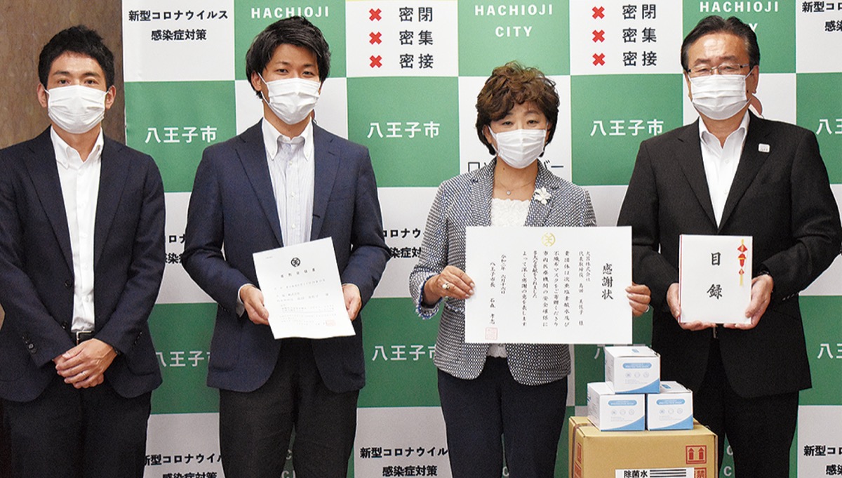 エネルギー関連企業大器(だいき)株式会社(港区)は八王子市内の医療従事者に使ってもらおうと3層不織布マスク4000枚と次亜塩素酸水10リットルを市へ寄付した。島田美佐子社長らが6月16日、市役所を訪れ、石森孝志市長に手渡した。