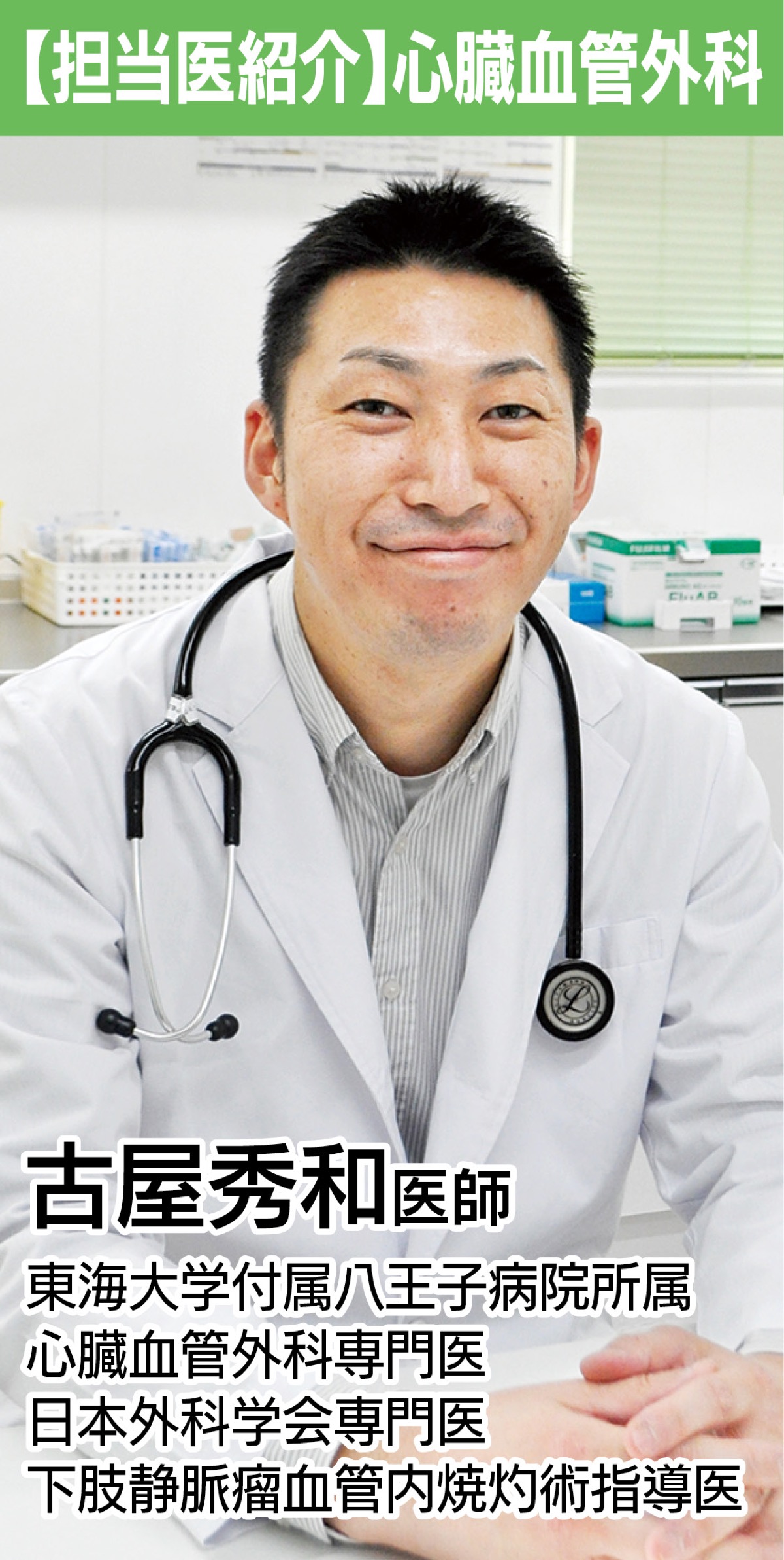 同外来では先進的高周波治療装置(ラジオ波)による血管内焼灼術やストリッピング術、硬化療法など、さまざまな日帰り手術に保険診療で対応。診療日を週4日設け、美容師など立ち仕事の人の要望にも応える。古屋医師は「困ったら一度受診を」と話す。