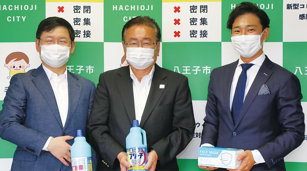 広告会社(株)日宣(千代田区)とインバウンドマーケティングを扱う(株)ENJOY JAPAN(新宿区)は7月3日、八王子市にマスク5000枚と衣料用漂白剤480本を寄贈した。同日、寄贈式典が行われた。当初は中国のグループ企業に送るために確保したものだったが、現地から「こちらは大丈夫。日本で使ってほしい」という気遣いがあり寄贈に至った。市内の小・中・義務教育学校107校に配布される予定。