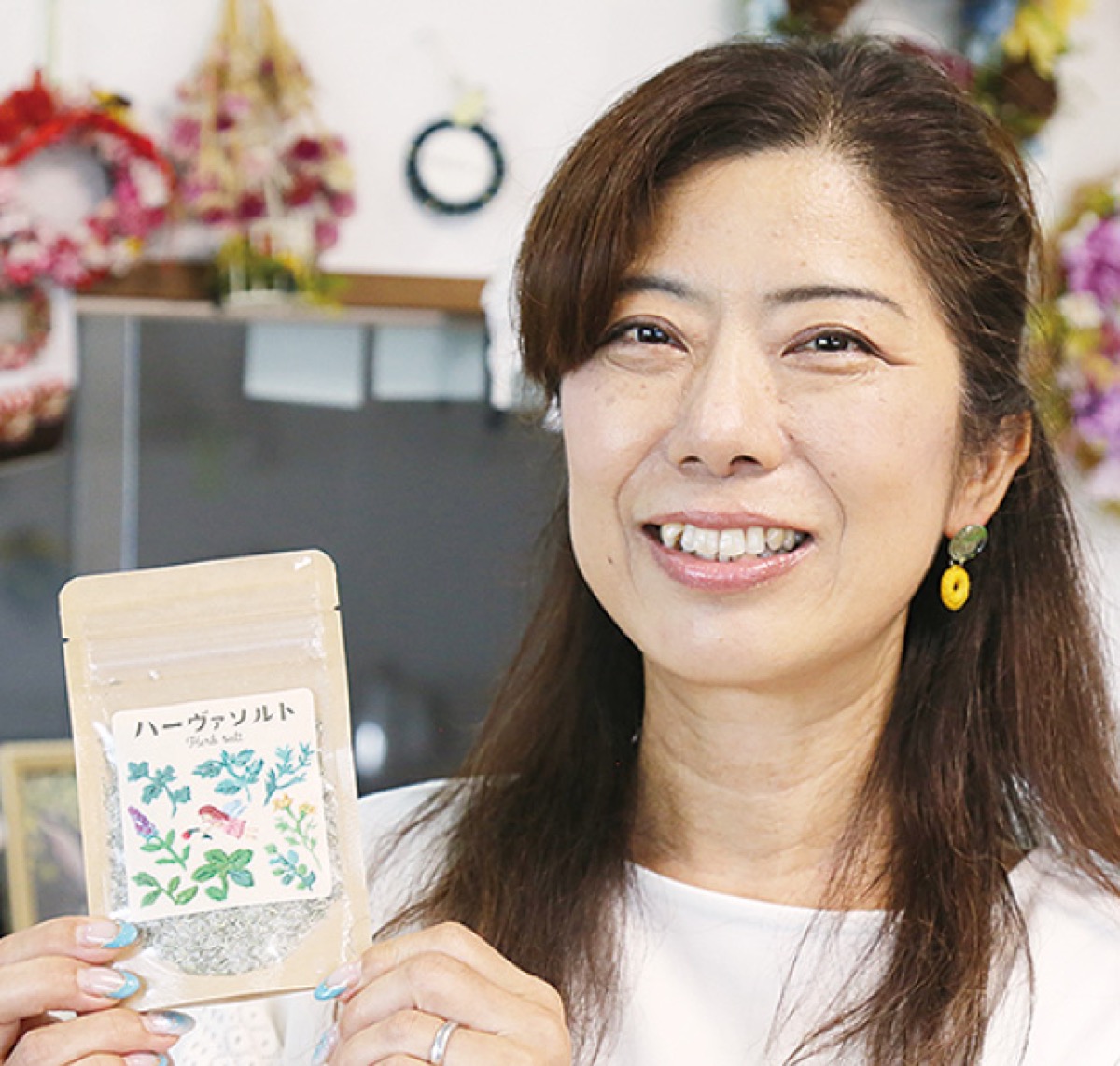 「サラダはもちろん、お肉や魚のソテー、スープなどに一振りすれば、香り豊かになります」と生産者の小山律子さん=人物風土記で紹介。ハーブの綺麗な色を出すのに苦労したという。