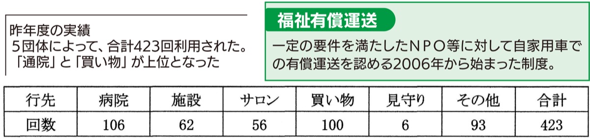 昨年度は合計423件の利用があった。高齢者の移動サービスをしている7団体が登録し、5団体が利用した。「市街地はバスなどもあるので必要性が高くない。車両を必要としている団体の多くが、山間部。一方で、車両のある場所(事務局)は散田町。車両の引き取りや返却には課題がある」と大福さんは話す。「利用を増やしたいという面もあるが、より大切な、ボランティアとして運転する上で必要な知識などにも興味を持ってもらえれば」