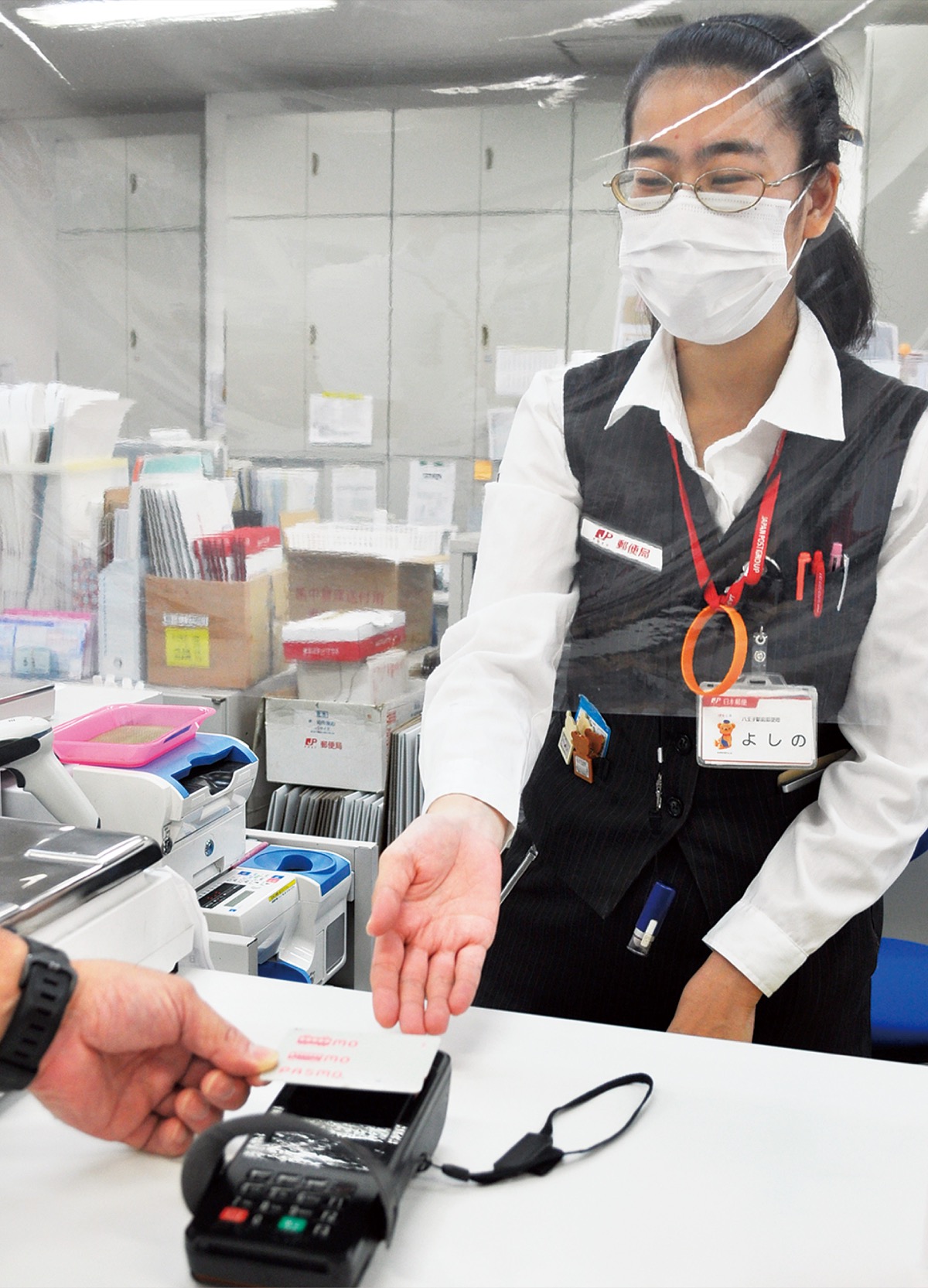 旭町にある八王子駅前郵便局は先行し2月からスタートした。「最初の頃は1日20件前後でした。徐々に増えています」と並木稔局長は話す。「駅に近いからか交通系のICカード、あるいはスマホ決済が多いです」という。なお「もちろん従来通り現金も利用できますのでご心配なく」と加えた。