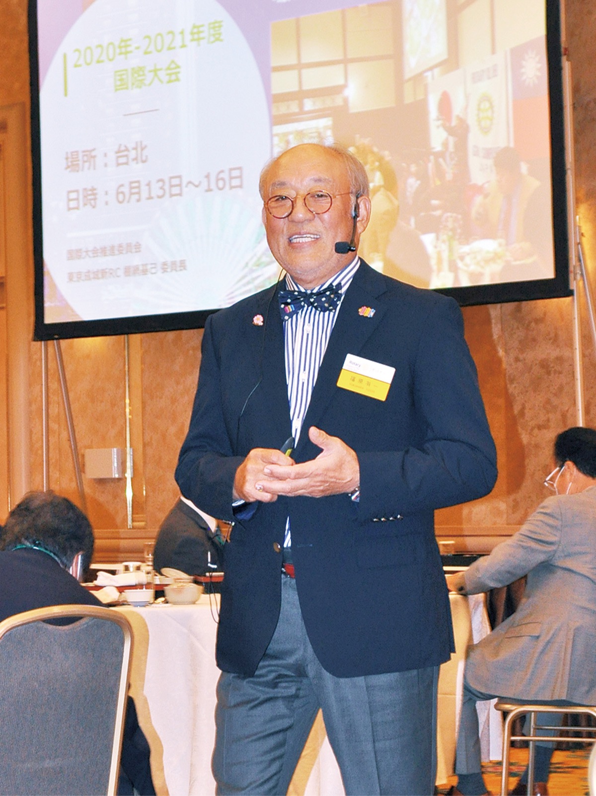 またRCの重点分野として新たに「環境の保全」が加わったことに触れ、スクリーンで温暖化による被害を紹介しつつ、使い捨てプラスチック禁止についてなどを語った。最後にそのために自分たちができることとしてリサイクルPET素材によるエコバックの使用を提案。地区会員4700人に配ると話した。「できることをひとつずつ」と訴えた。