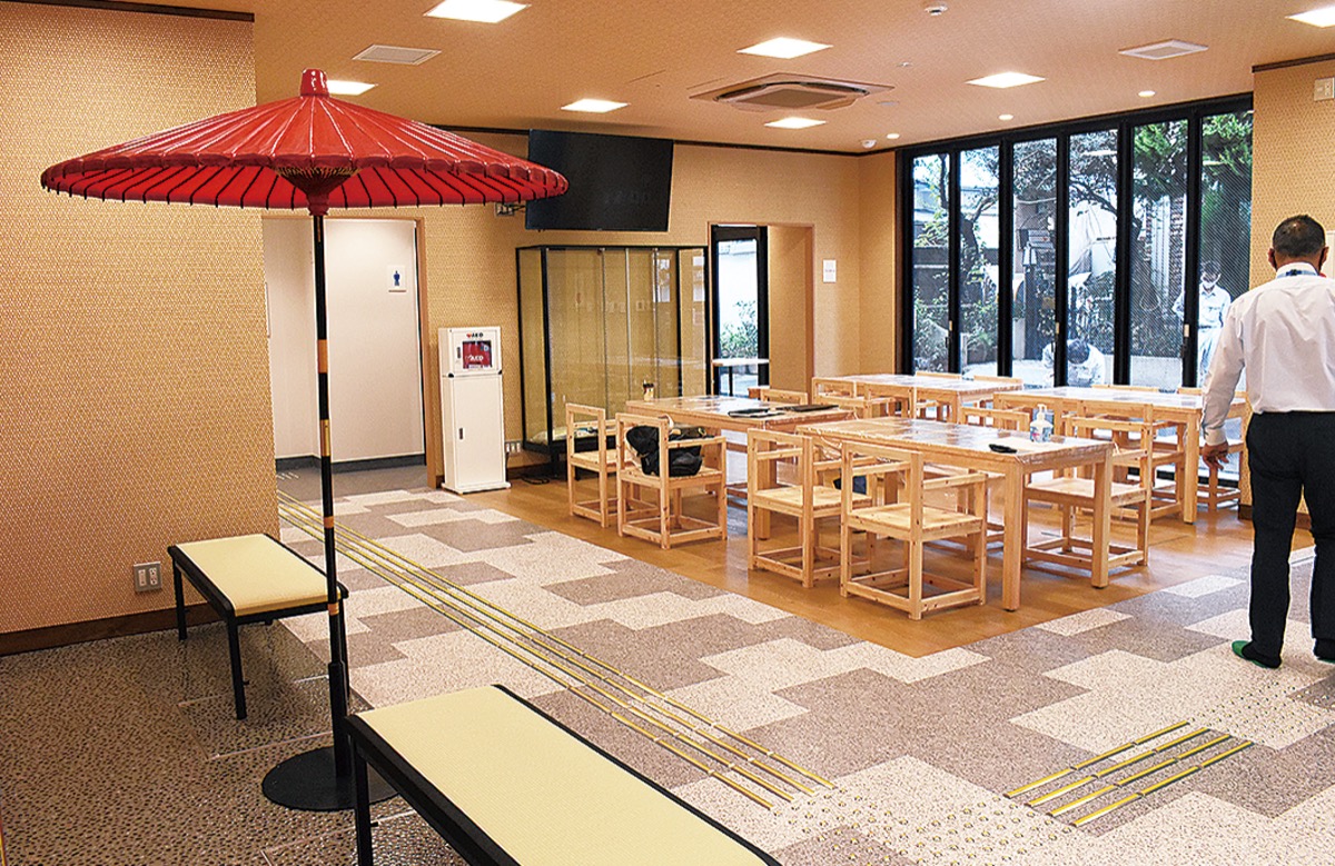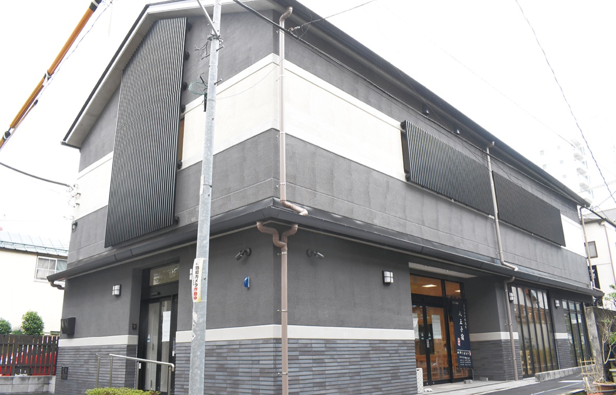 施設の周辺は多摩地域唯一の「花街」。その雰囲気を演出するよう建物は周囲にあわせ黒塗りの壁となっている。入口に立てかけられた幟旗は、八王子織物工業組合に依頼して作られた。藍色の布地には、15の宿場の名前が織り込まれている。