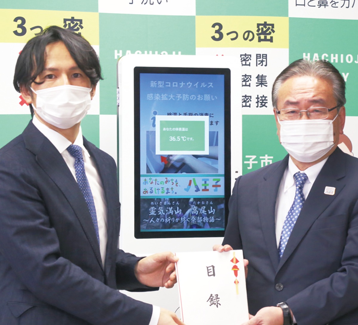 八王子市に新型コロナの感染対策としてデジタルサイネージ(電子看板)と自動検温器、自動噴射消毒液がセットになった機器「サフィマ」が寄贈された。10月23日、市長室で受領式が行われた。現在、八王子駅南口総合事務所入口で稼働している。