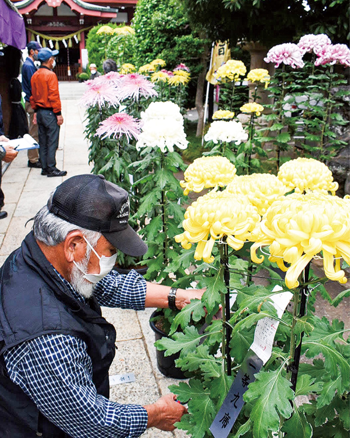 八幡八雲神社(元横山町)で、今年で第70回目となる奉納菊花展が行われている。「今年は8月の終わりから9月にかけて高温が続いたため、成長が遅れている」と八王子愛菊会会長の和田益男さんは話す。