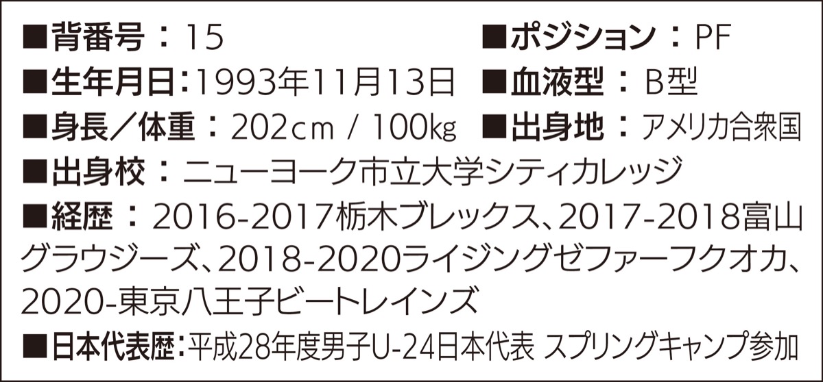 「カーメロ・アンソニー。ニューヨークでプレーをよく観ていて、ミドルシュートがすごいと思った。日本に来てからはBリーグのベテラン選手を尊敬している。プロ意識など真似をしていきたい」