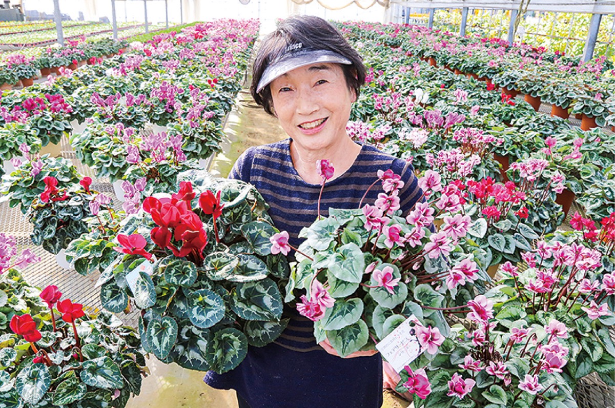 「部屋に飾ってあるだけで、気持ちが温かくなります。春先の3月くらいまで、部屋に彩りを添えてくれます」。そう話すのは、近郊で唯一、シクラメンの生産・直売をしている農家の石川研さん(高月町)。市場にあまり出回っていない2品種も取り扱いも開始。「家の中で家族と過ごす時間が増えたからこそ、内面を見つめ直すきっかけになれば。作り手冥利に尽きます」。贈り物にも最適という。