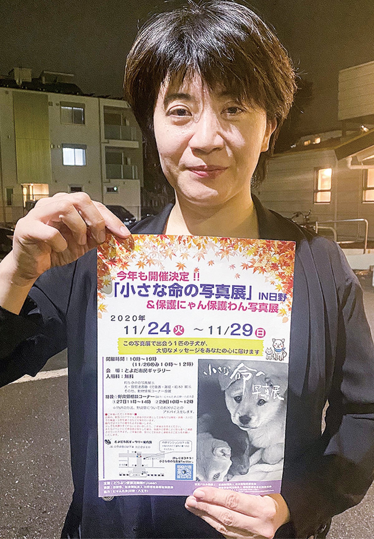 東松さんは数年前に報道された、ある虐待事件がきっかけで保護犬、保護猫について強く関心を抱くように。「ペットショップは華やかですがその裏で辛い思いをするペットもいる」とし、飼うことについて「ショップ以外にも家族を待っている子がいると知って欲しい」と話す。写真展によって「傷つけるのも人、それを救うのも人。救う側の人が増えてもらえれば」と期待する。期間中の連絡は【電話】042・586・1961へ。