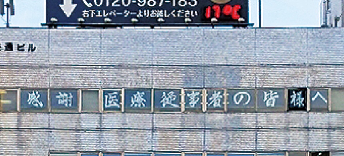 青色のマスクには同社のロゴとともに「感謝」の文字などが印刷されている。感謝は「医療従事者の皆様」への思いで、青はその際の表現によく用いられる色。担当者は「頑張っている方々を少しでも応援できれば」とし、利用者にマスクを見てもらうことで「感謝の思いが広がるといいですね」と期待する。なお、マスクは明神町の「はんこ屋さん21」製作によるもの。