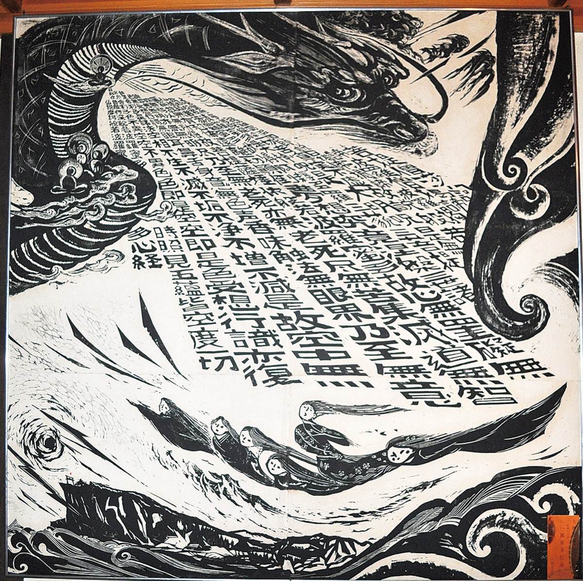 作品「おひめぶち」は大塚さんにとって初めての「2メートルの大型作」で2001年に制作したもの。大塚さんによるとおひめぶちは「天女が舞い降りてくる」伝説で、作品ではその場面に般若心経の文字をレイアウトした。