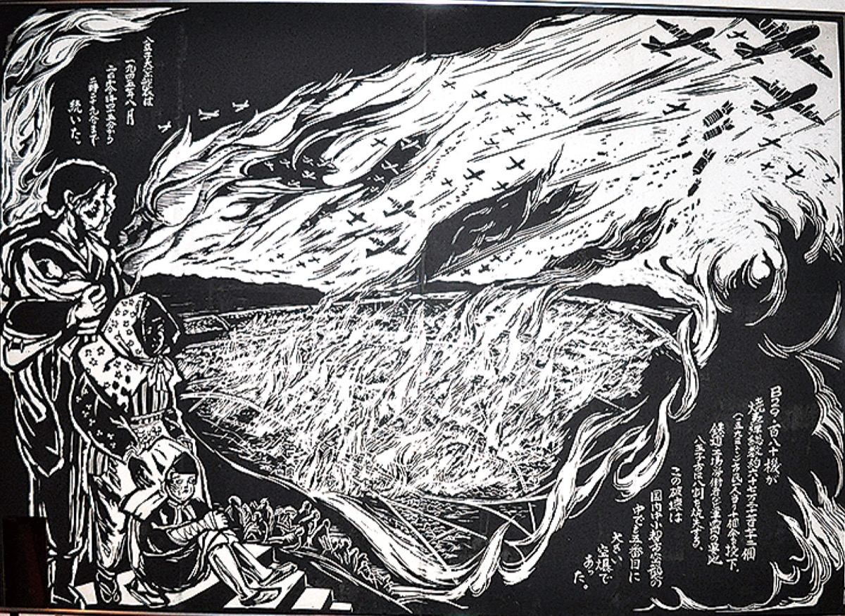 寺院にはもうひとつ作品「八王子空襲」=下写真=がある。07年のもので、空爆の恐ろしさを伝えている。