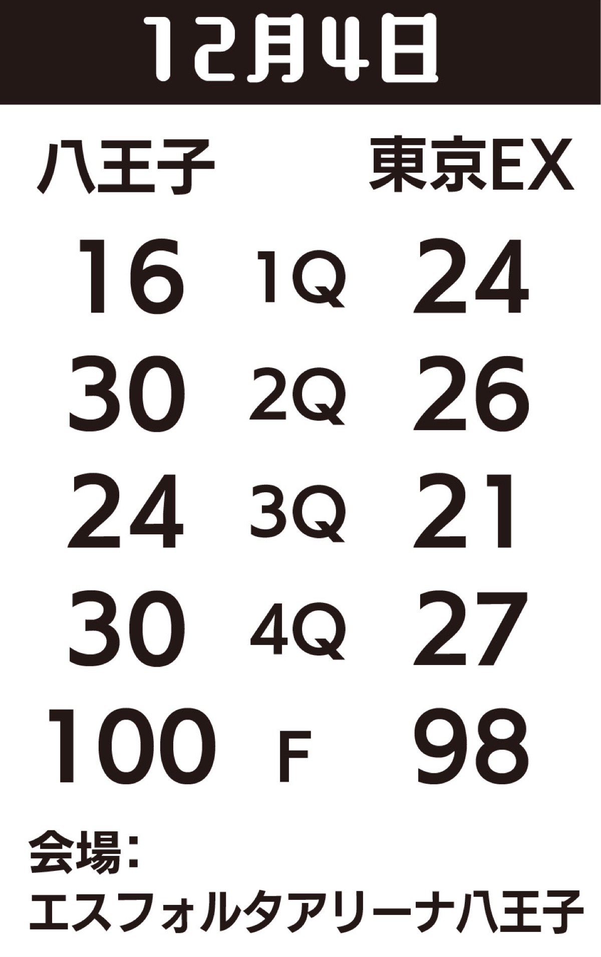 なお5日は板橋区で同じ対戦があり八王子は67対91で敗れた。