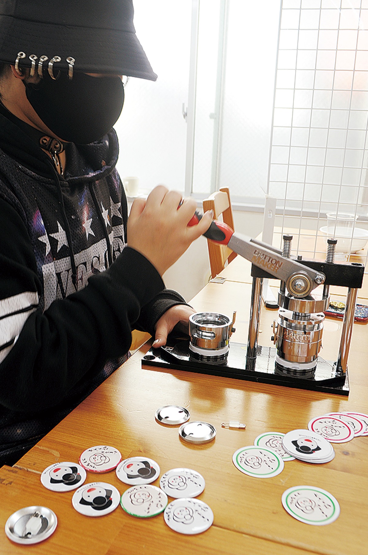 缶バッチを製作するのは、八日町にある就労継続支援B型事業所「ファーストステップ」。同作業所では、コースターなどの小物や絵画、陶芸を製作し販売している。缶バッジは運営するNPO法人しあわせのたねの職員が同組合に縁ががあったことから提案した。現在は受注生産のため多くは作っていないが、来年の地域作業所が出店するイベントで販売する予定。作業所利用者の鈴木敏晴さんは「イベントなどで早くお客さんの反応がみてみたいね」と話した。