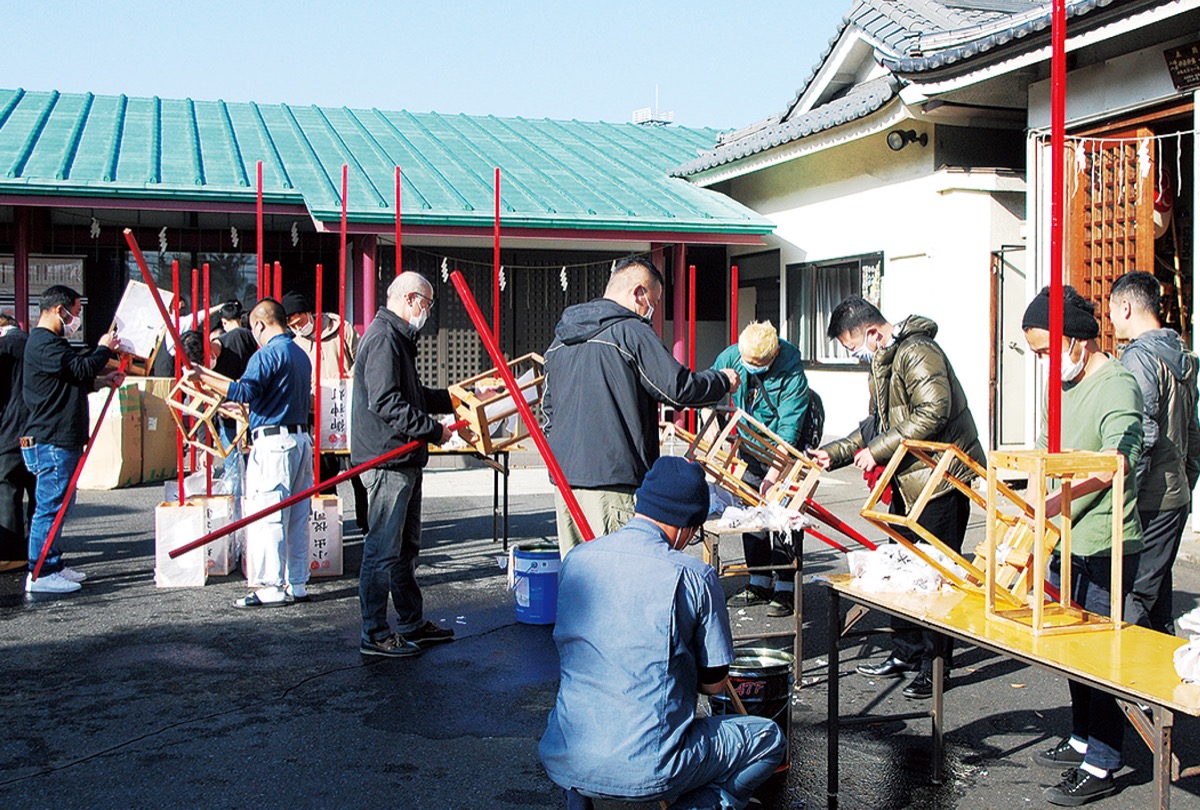 この日は会員20人以上が参加。ご神灯に貼られた和紙をはがす作業を行った。ご神灯は、31日、参道の両側に設置される。今年は新型コロナの感染拡大により、恒例の厄除けそばや甘酒、奉納囃子などは中止に。同青年会の栗原一会長は「催しができず青年会はストレスが溜まり気味。来年は行事が行えるようコロナが収束するのを願うばかり」と話した。