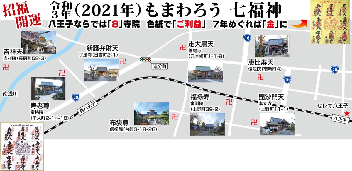 開運企画「八王子七福神めぐり」が2021年1月1日(祝)から10日(日)まで、市内8つの寺院を会場に行われる=MAP参照。主催は八王子七福神会。コロナ禍の実施となり「密を避けて、自己管理の上、参加をしてください」と呼びかける。