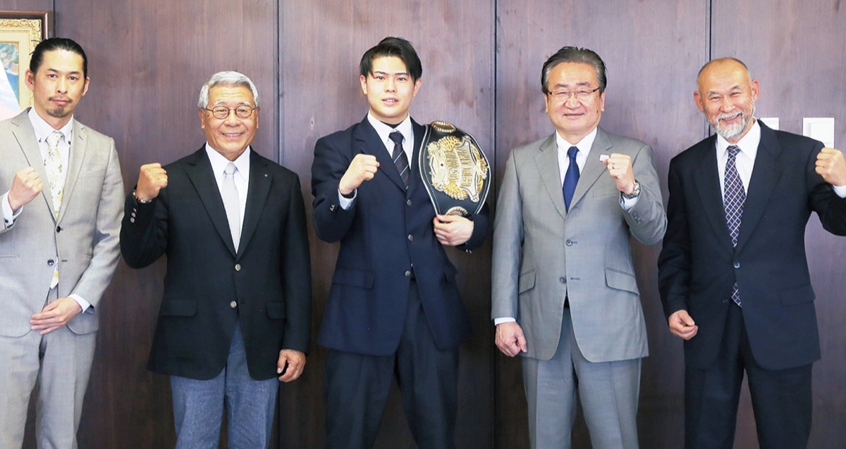 昨年12月26日に墨田区で行われたボクシングの試合で、都立八王子拓真高校4年生で八王子中屋ボクシングジム(南町)に所属するプロボクサーの佐々木尽さん(19・別所在住)がTKO勝ちし、日本ユース・スーパーライト級のタイトルを獲得した。これで戦績は10戦10勝(9KO)。1月21日に八王子市長に表敬訪問を行った。