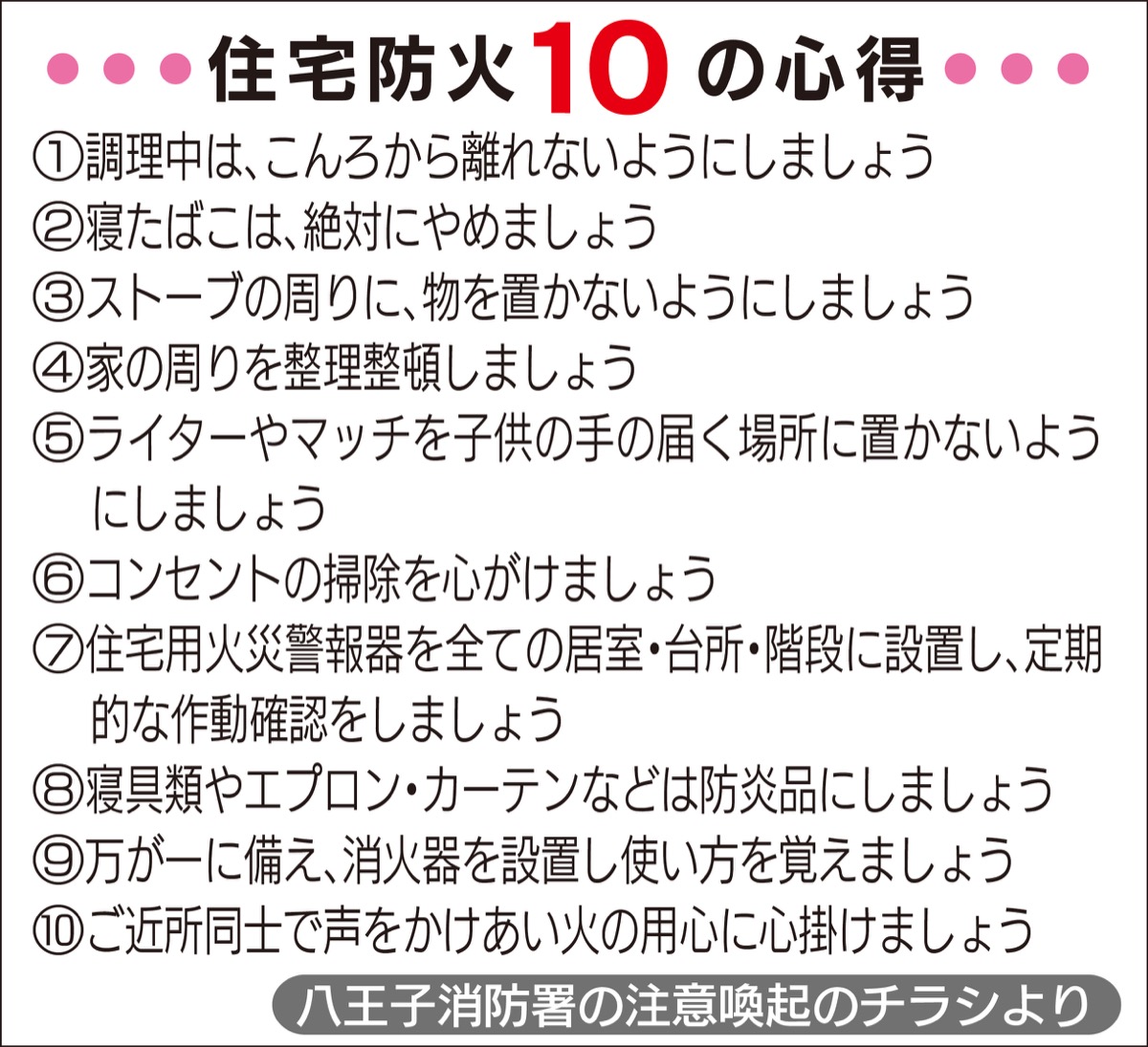 八王子消防署では住宅火災による死者が前年度に比べて大幅に増加していることを受け1月12日、死者防止緊急対策推進本部を立ち上げた。昨年12月1日から今年1月21日までの間で、市内で6人が火災で死去した。