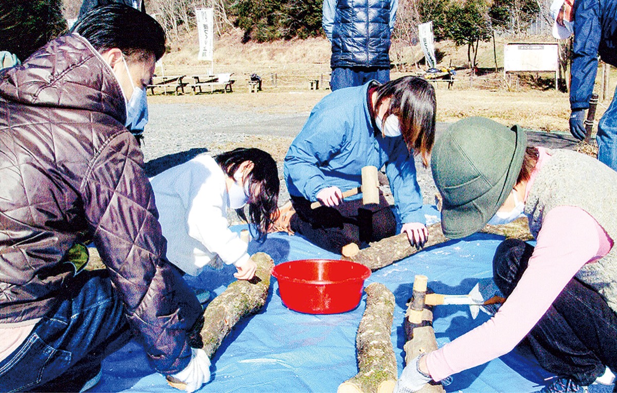 原木は里山で伐採したコナラの木。会員が事前に栽培用として90cmほどに切断し、およそ70本を用意した。参加者は指導者の指示に従い、原木にしいたけの菌を打ち、それぞれ持ち帰った。「(密を避けることが必要とされている中)屋外の行事であれば安心と思い応募しました。美味しく食べるのが楽しみ」と喜ぶ声が聞かれた。なおしいたけは来年秋頃に食べられるようになるそう。