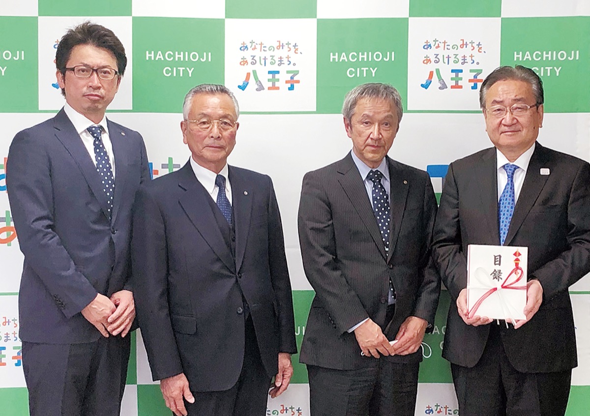 社会奉仕活動を行う東京八王子東ロータリークラブ(加藤登会長)は、新型コロナウイルス感染症対策に役立ててもらおうと八王子市に100万円を寄付した。3月11日、同クラブの加藤会長、菅原孝さん、内田智さんが市役所を訪れ、石森孝志市長に目録を手渡した。