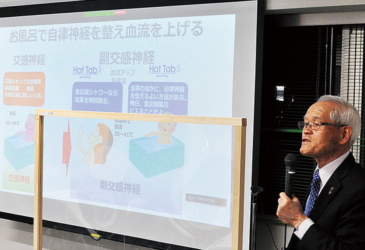 定期的に開催しているもので今回の講師は一般社団法人重炭酸温浴健康普及促進協会の小星重治氏。小星氏は推奨する「重炭酸温浴」について1時間にわたり解説=写真。およそ20人の参加者が耳を傾けた。