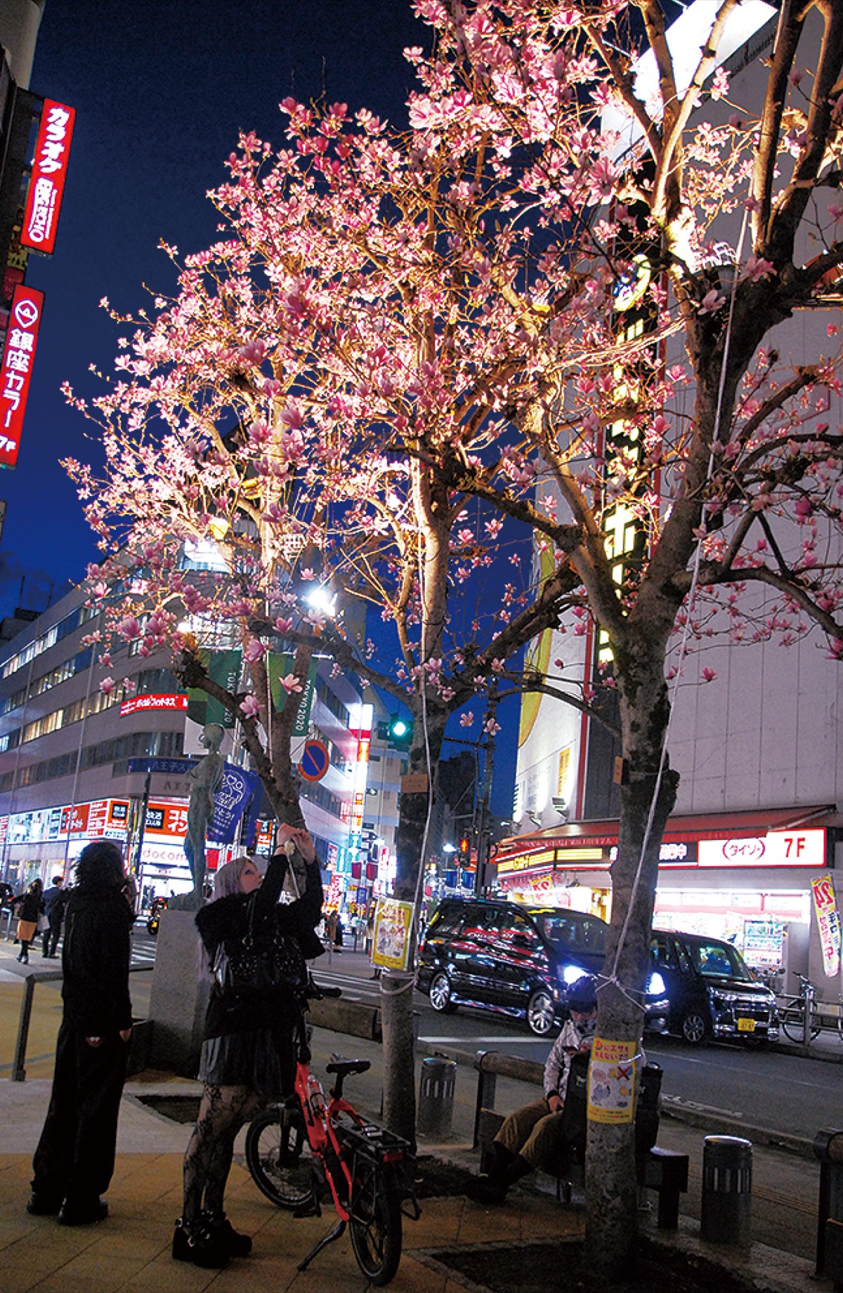 八王子駅北口、西放射線ユーロード沿の三崎町公園では、シモクレンのライトアップ=写真=が行われている。
