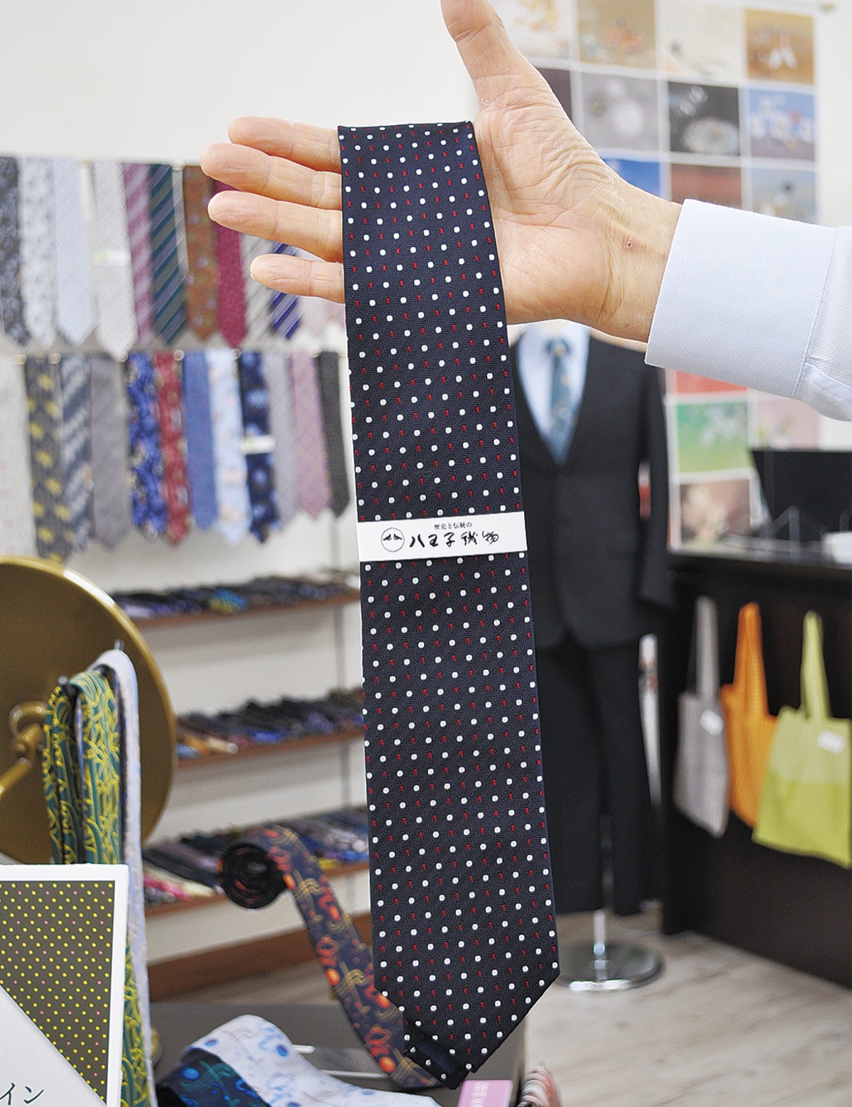 進呈するネクタイは八王子産のもの。八王子織物工業組合によると、市内で現在、およそ10の業者がネクタイを生産している。昨年度の総売上は4億円にのぼるそう。絹100%のものがほとんどで、「贈答用」に用いられることもある。