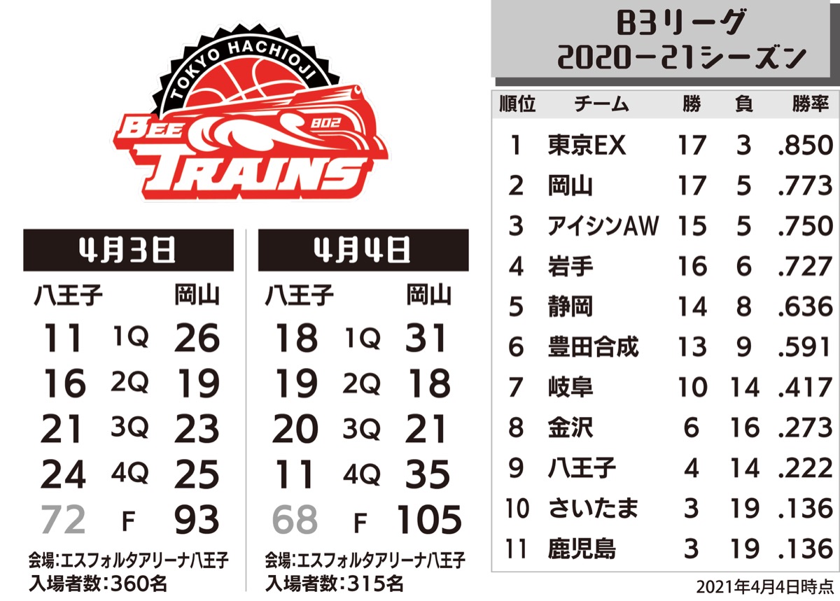 B3所属のトップチームは4月3、4日、狭間町のエスフォルタアリーナ八王子でトライフープ岡山と戦い連敗した。これで前節から4連敗となった。
