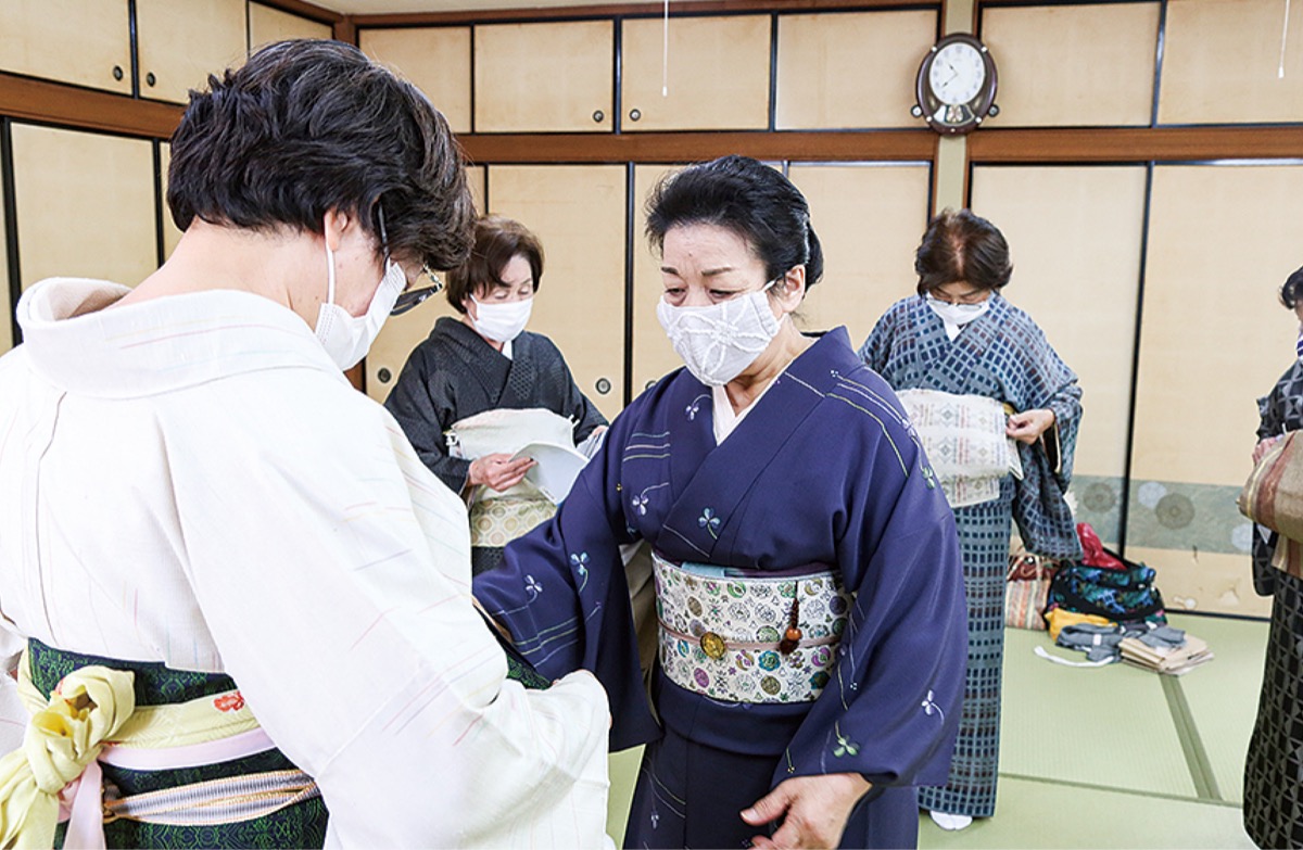 コロナ禍で遠出がためらわれる状況の中、「せめて週に1度くらいはおしゃれをして楽しみたい」という人が足を通わせているのが「きものにしわ」(八幡町)が開催する前結び着方教室。