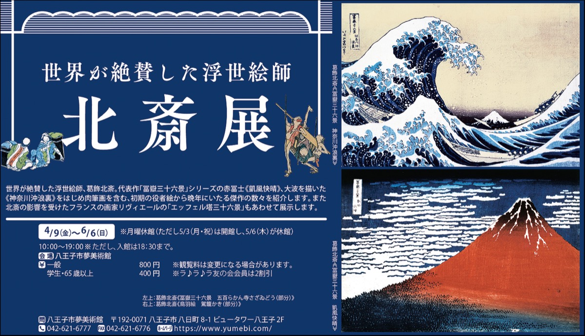 同館を管理運営する公益財団法人八王子市学園都市文化ふれあい財団(村松眞貴子理事長=人物風土記で紹介=)は、展示の見どころや同館館長のインタビュー動画をホームページ(財団名で検索)上で公開している。村松理事長は「職員による解説もあり、より深く北斎展をお楽しみいただけます。お出かけ前にぜひご覧ください」と話す。