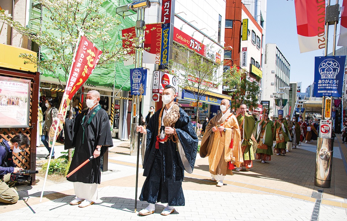 およそ10人の僧侶が八王子駅北口の西放射線ユーロードから、法要を行う興林寺(子安町)までを歩いた。雅楽を演奏する僧侶や感染症対策についての募金箱を持つ僧侶もおり、通りがかった市民の中には、手を合わせるなどし見守る人もいた。
