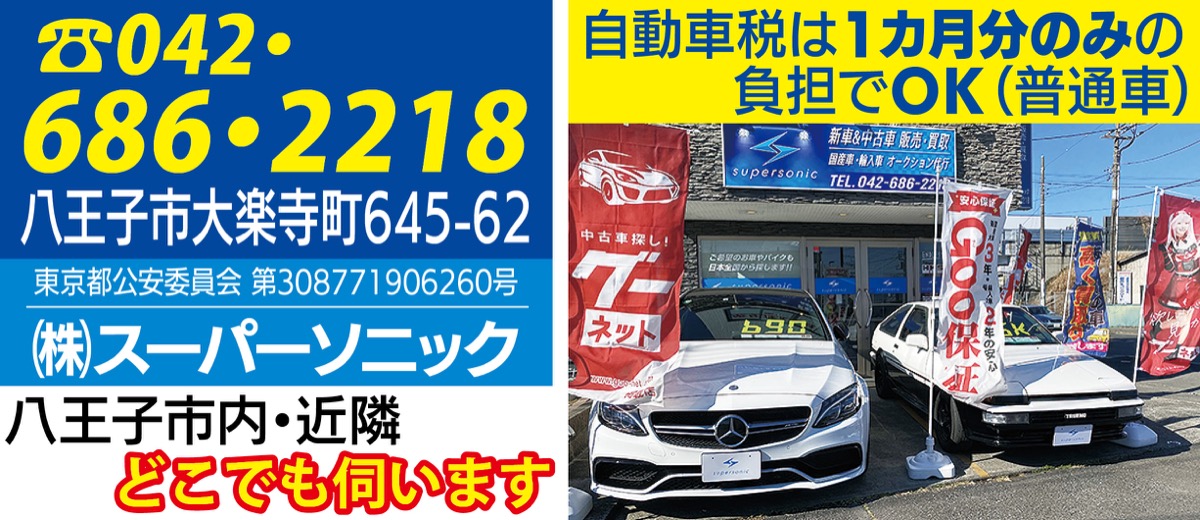 「『廃車にはお金がかかる?』いいえかかりません」。転居や出張、免許返納で乗らなくなった車の処分は、大楽寺町の車買取店スーパーソニックに相談を。素早く親切な接客が評判の同店。丁寧な対応は店主の車に対する深い愛情の表れだ。どんな古い車でも最低価格2万円(普通車)〜買い取り。面倒な手続きは全て同店にお任せ。手数料も負担してくれる。「お気軽にご相談ください」