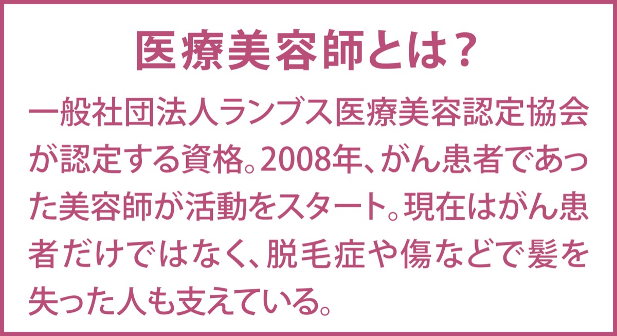 医療美容師の尾熊英一さんは自身が休みの日の火曜日と木曜日に個室のがん患者専門の美容室「イルミエール」を経営。遠くは他県から通う人もいるという。「日本中の美容師が医療美容師になれば、通う人の負担も少なくなるはず」と夢を語る。