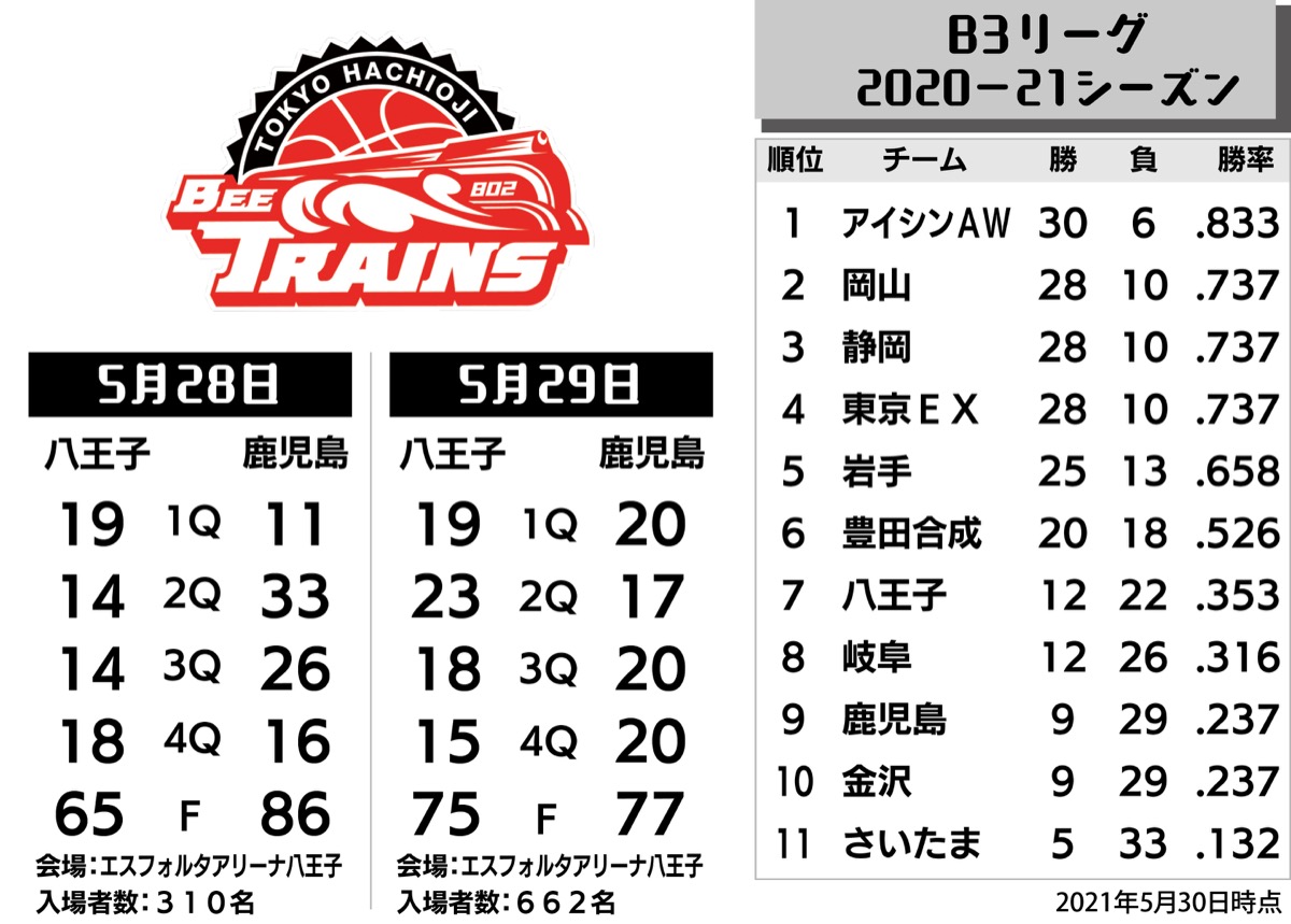 プロバスケB3東京八王子ビートレインズは5月28、29日、エスフォルタアリーナ八王子(狭間町)で鹿児島レブナイズと戦い連敗した。