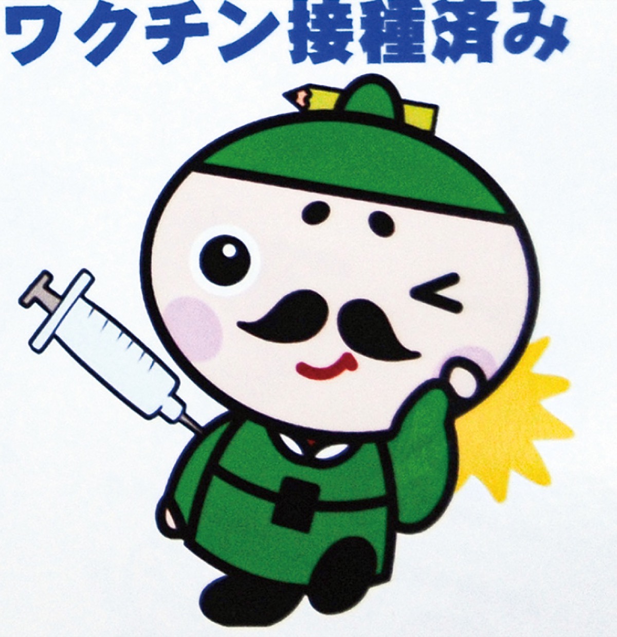 デザインは同商店街のマスコット「かんこうさん」が注射を打たれた絵に「ワクチン接種済み」と明記。シールや缶バッジなどを検討している。発案者の中本康之さんは「お客さんが接種の予約がとれたと嬉しそうに話している様子をみて、周囲に知らせたいのではないかと考えた」と話す。