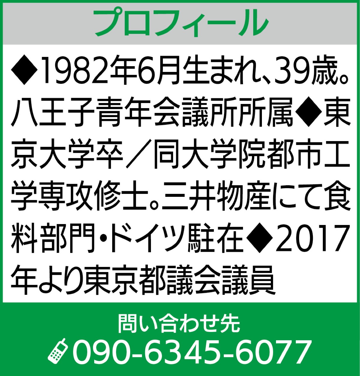 縁あって、八王子に移り住み、都議会議員になりました。外から来たからこそわかること、八王子にまちづくりで恩返ししたいと思い、日々取り組んでいます。今回はまちづくりを書きましたが、39歳、教育や子育て環境の充実、公園活用、防災対策などに力を入れて取り組んでいます。