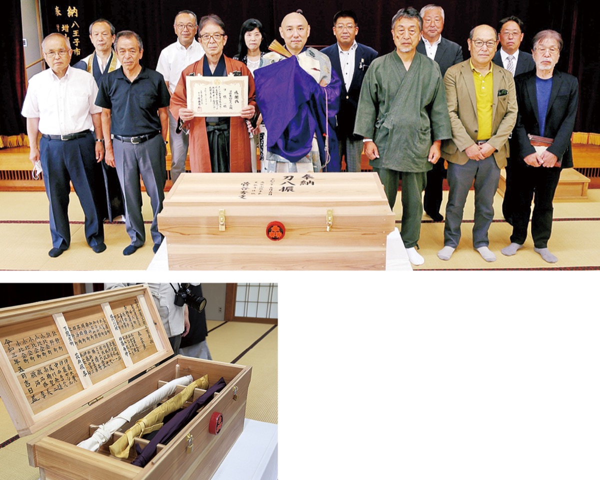 市内を中心とした刀剣愛好家など有志による高尾山薬王院への奉納式が6月11日に行われた。奉納したのは刀を保管するために使う「刀櫃(かたなびつ)」と呼ばれるもので、同院の菅谷秀文執事長がこれまで同院に奉納した刀8振りを収納するために用いるという。
