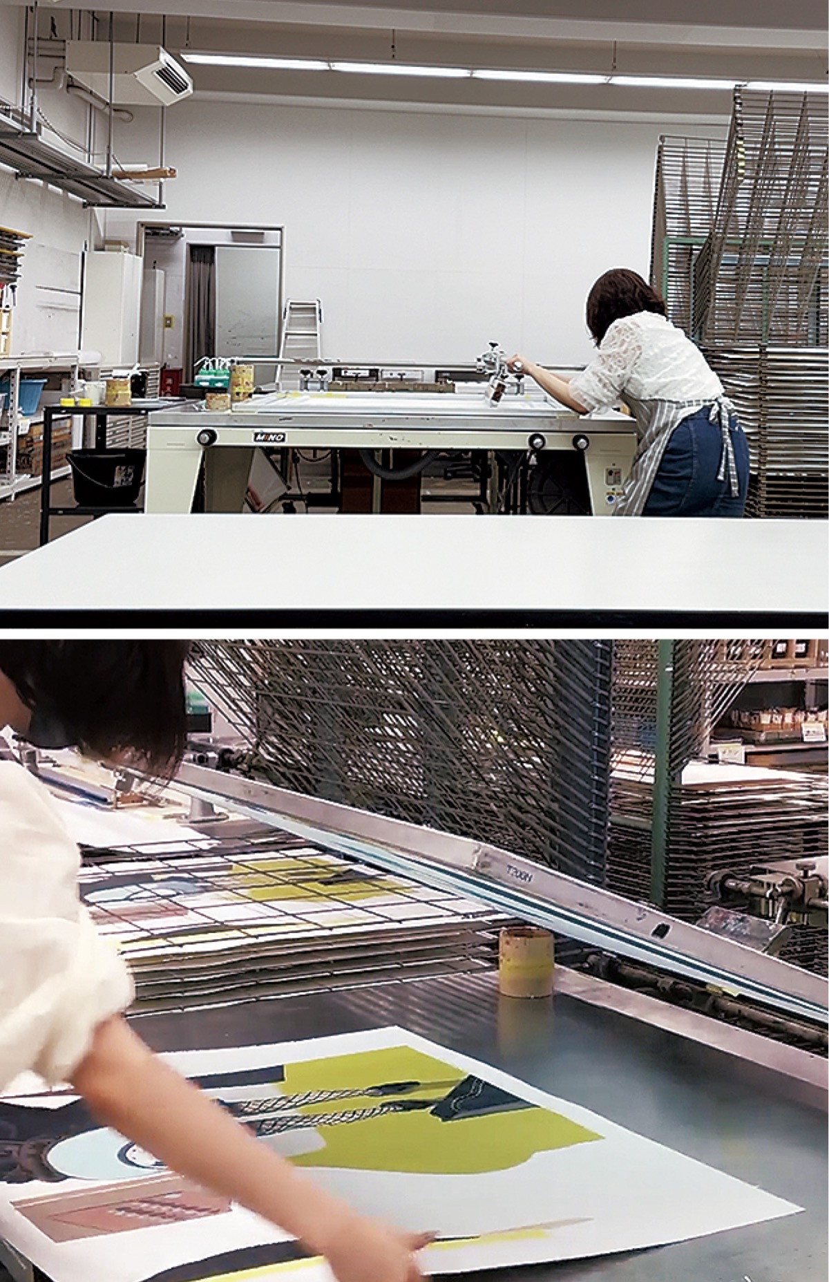 タブレット端末で下絵を描き印刷し、露光機にかけ乾かすと「版」ができあがる。力作業の部分もあり「(筋肉が)バリバリになります」と笑って話す。三宅さんの作品は今回の展示の他、自身のインスタグラム(aoi_printmaking)で見ることができる。