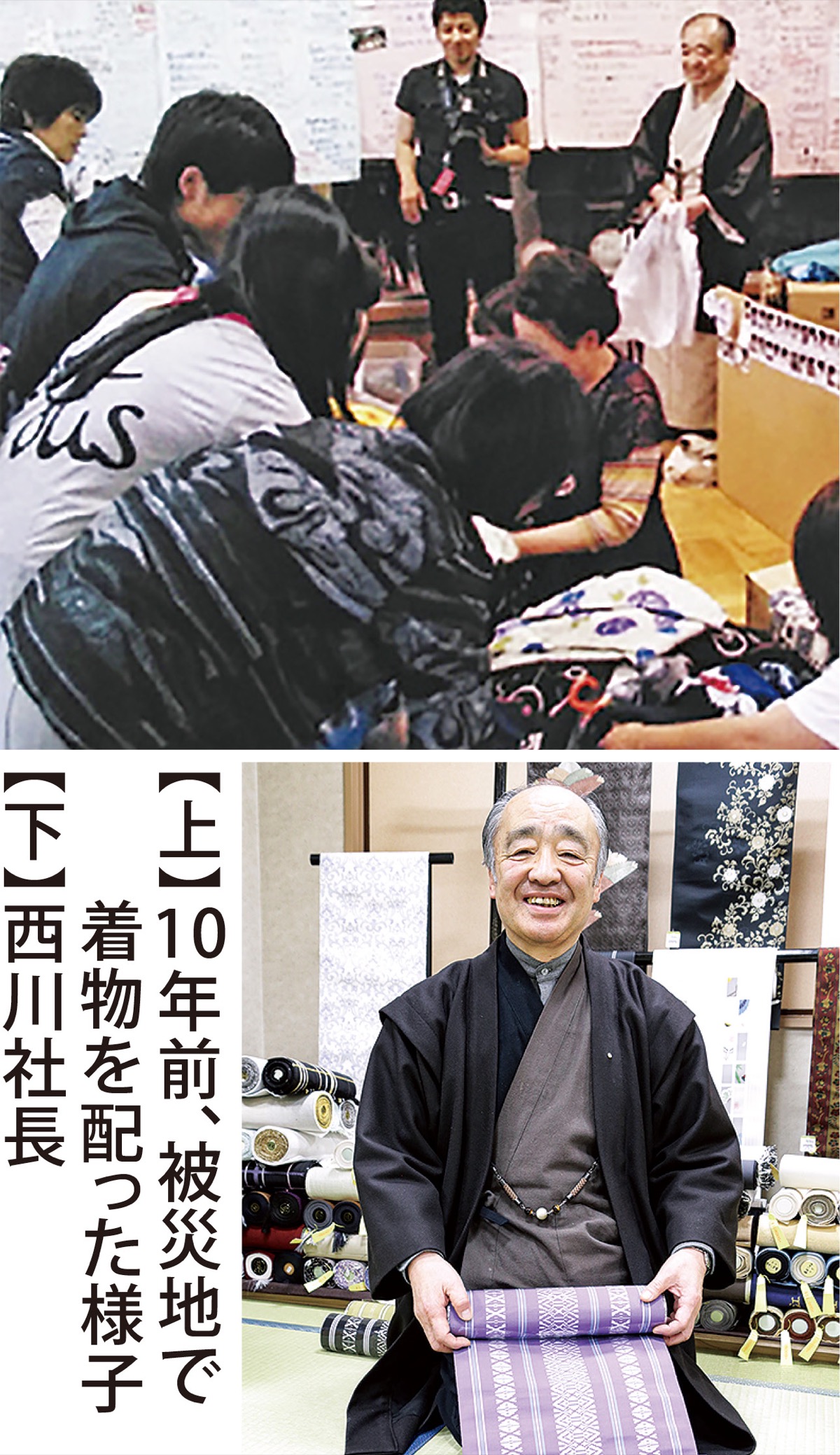 にしわの西川誠治社長は、NPO法人きものを着る習慣をつくる協議会の会員として大震災後、「津波で全て流された被災者に祭りで着る浴衣を」と、着物や浴衣を被災地に届けた1人。その後も店として被災地支援の活動をしてきた。