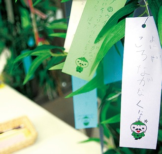 笹に吊るされた短冊にはコロナ収束を願うものが多くみられた。七夕飾りは7日(水)まで。